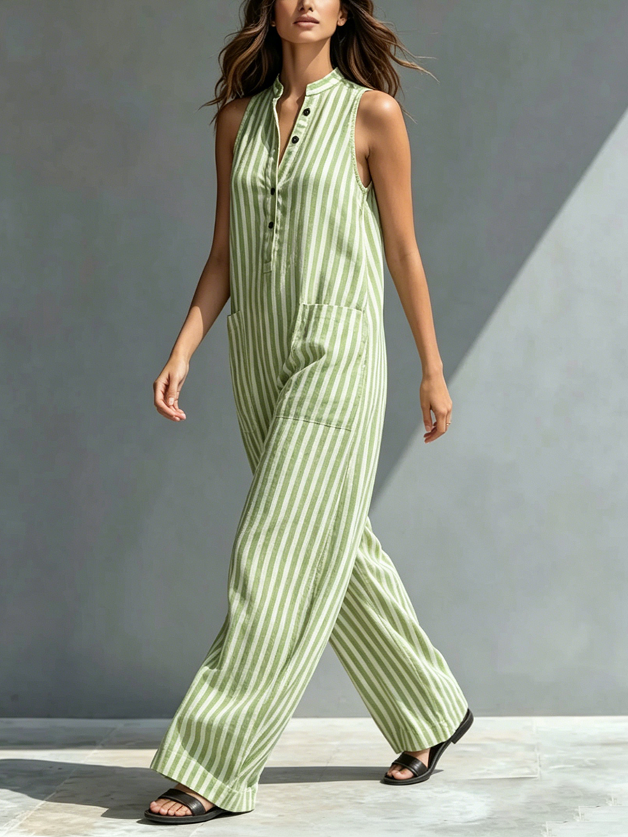 Classic Striped Loose-fit Cotton-linen Jumpsuit