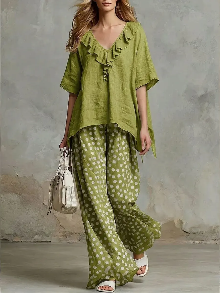 Women's Solid Color Ruffled Art Casual Top And Polka Pants Cotton Linen Suits